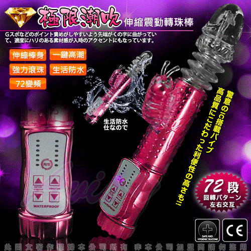 最新強力電動伸縮按摩棒,可同時震動陰道、陰核,震動力強勁!耐用、耐操,同時可震動,遠遠超越了男性陽具所能發揮的體能極限,強烈的戳幹力,幾乎讓人無法一手掌握,再怎麼強烈的燎原慾火,也會被它所撲滅夷平。中間的環紋部分不停地伸縮、抽動,在您的私處進出、摩擦;小蝴蝶的拍打、添吸著您最敏感的陰蒂……