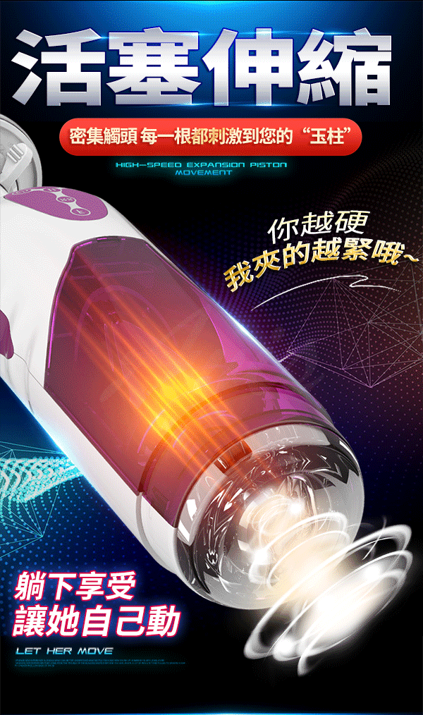 全自能伸縮智能貴妃杯全新體驗擁有10段自動伸縮活塞模式高速狂插讓您躺著享受讓她自己動爽到捨不得拔出來。搭配美女智能語音嫵媚嬌喘發音,如臨其境般淺吟呻吟讓您欲罷不能~貼心的智能加溫保持舒適溫度溫暖的包裹住您。並擁有強力吸盤讓您可以免手提多種角度隨時隨地任意玩,徹底解放您的雙手喔